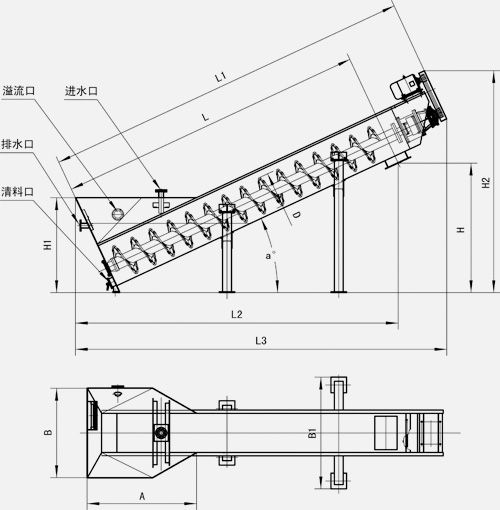 洗石機由驅(qū)動裝置、殼體、螺旋體、支架、清水泵、排污泵、電控箱等組成。根據(jù)不同工藝要求可增設(shè)相關(guān)設(shè)施。